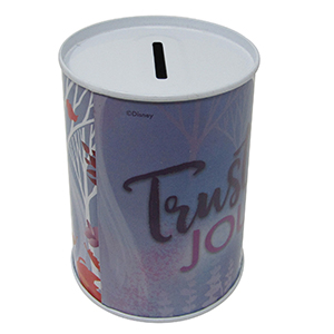 Alcancía metálica cilíndrica sin tapa, requiere un abre latas para abrirse.