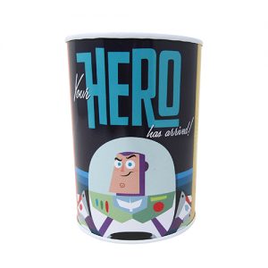 Alcancía metálica cilíndrica sin tapa, requiere un abre latas para abrirse.